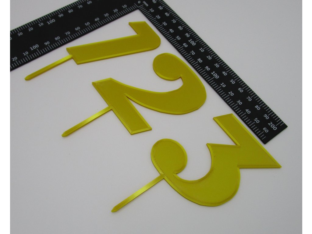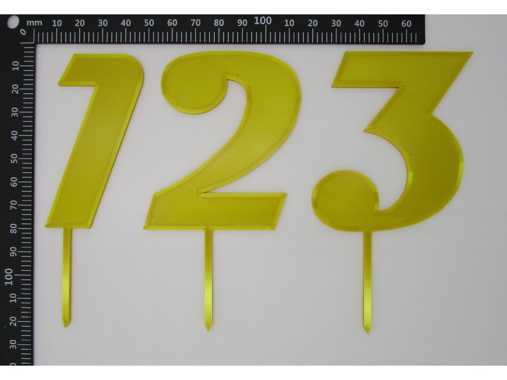 Číslice určené pro zapíchnutí do dortu - jednotlivě. Font Magneto 75 mm.