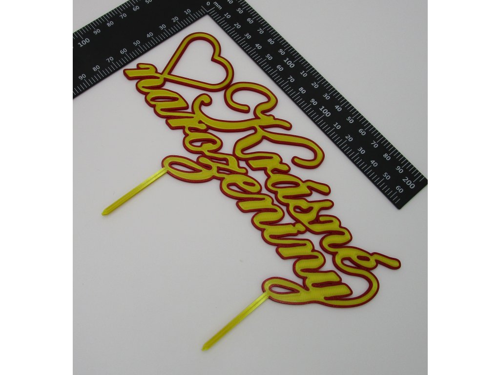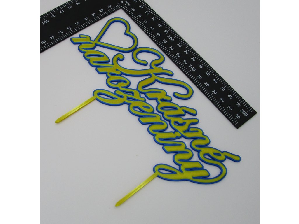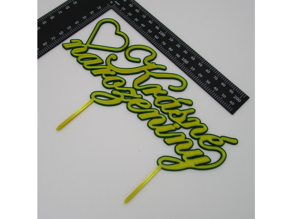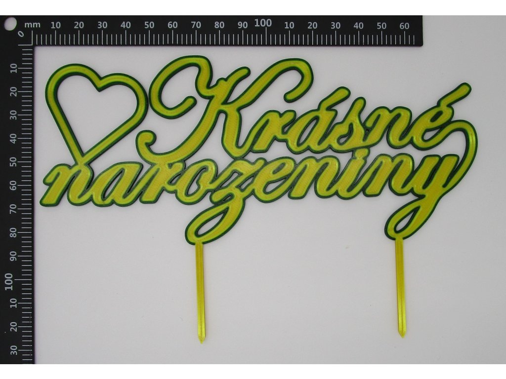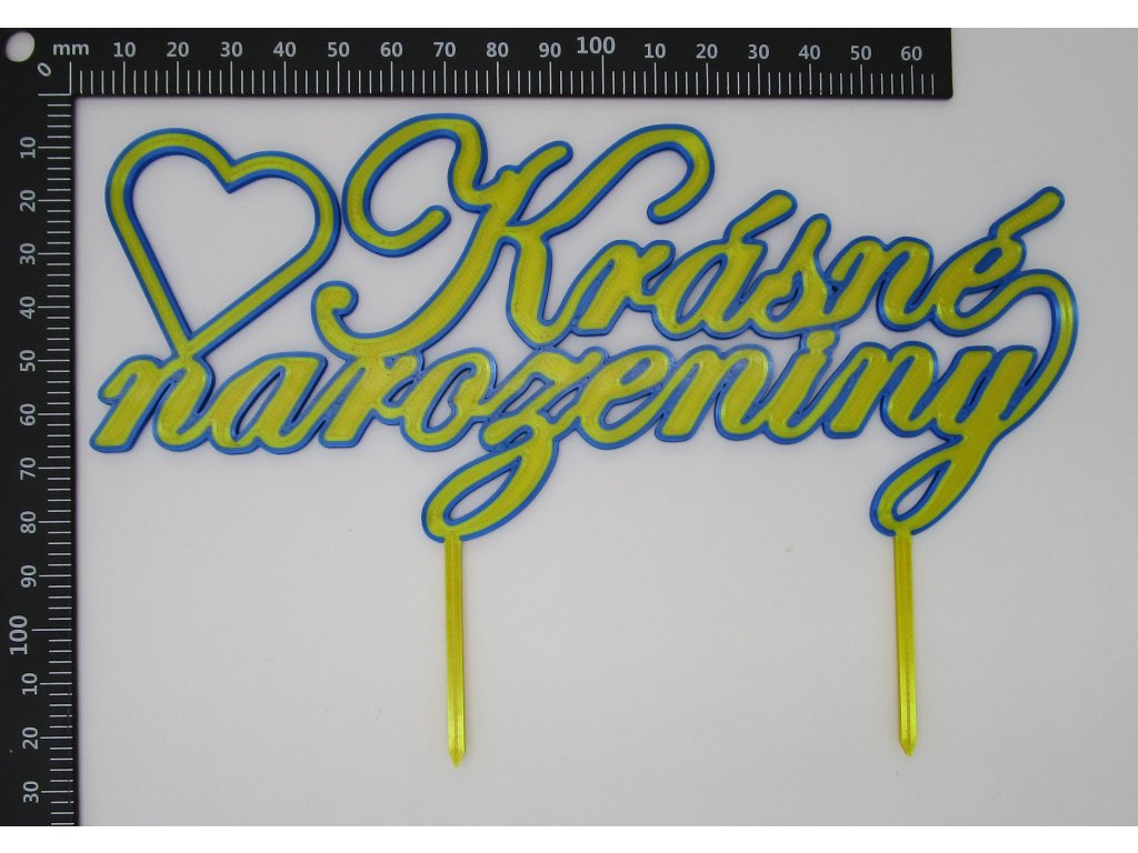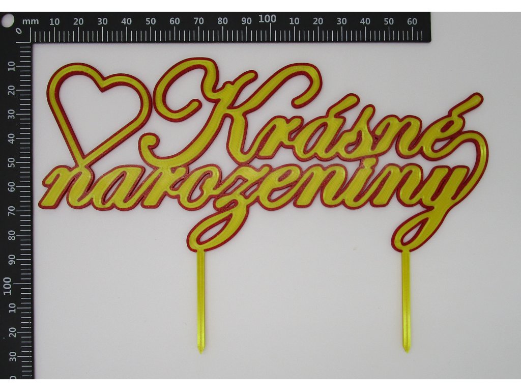 Zápich do dortu ve tvaru textu "Krásné narozeniny" ve dvoubarevném provedení.